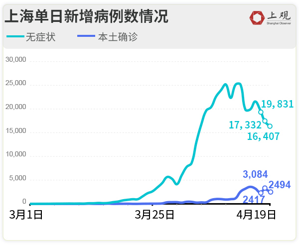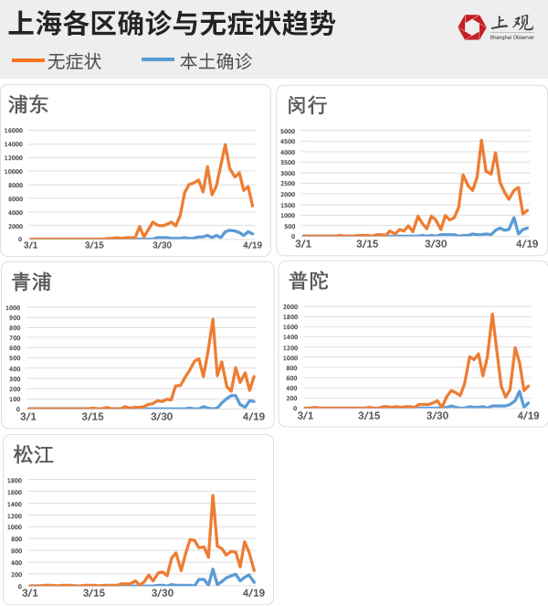 4月13日,浦東單日新增無症狀感染者數達到峰值,超過1萬3千人。而4月19日,這一數值已降至4926人。