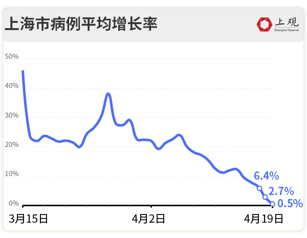 通過計算發現,上海目前病例數的平均增長率在不斷下降,4月19日的數值為0.54%,而此前最高值為46.05%。