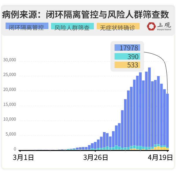 在4月19日新增的18901例患者中(含無症狀與確診病例),95.12%的患者在閉環隔離管控中被發現,2.06%的患者為風險人群篩查,而2.82%的患者為此前的無症狀患者轉為確診病例。