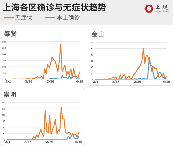 4月3日,金山區單日新增無症狀感染者達到峰值,單日新增99人。而4月7日,單日新增確診病例數也創新高,為72人。但在此之後,金山區新增病例總數不斷下降,在4月19日,單日新增病例總數僅為9人。