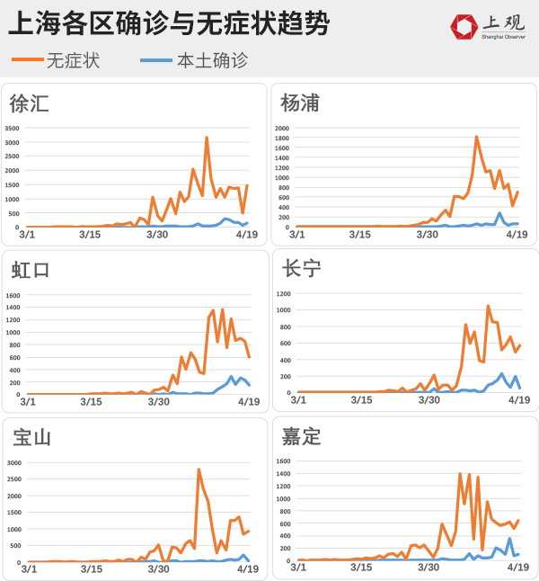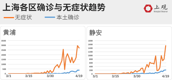 黃浦區單日新增確診人數在4月13日突破200人,4月19日創新高,有368人確診;無症狀感染者數量則在4月18日達到新峰值,為2961人。