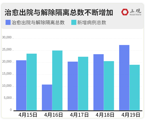 在4月15日,治愈出院與解除隔離的總數超過2萬人;在4月18日超過當日新增病例總數,而4月19日更是比當日新增病例總數多出8192人。
