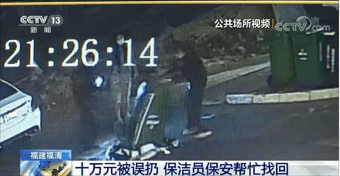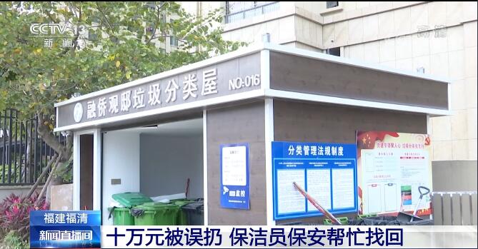 央視網消息:近日,在福建福清一位市民誤將裝錢的袋子丟掉,損失了10萬塊錢,好在熱心保潔員和保安及時找回,完璧歸趙。