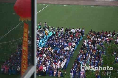 7月1日,來自玉樹藏族自治州民族中學的1200余名師生在都江堰八一聚源高級中學舉行開學典禮,並正式復課,這群來自玉樹災區首批異地復課的師生將在這里度過至少兩年的學習生活。圖為開學典禮儀式現場。 中新社發 張浪 攝