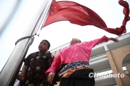 7月1日,來自玉樹藏族自治州民族中學的1200余名師生在都江堰八一聚源高級中學舉行開學典禮和升旗儀式,並正式復課,這群來自玉樹災區首批異地復課的師生在6月28日至30日分三批乘坐火車抵達四川,將在這里度過至少兩年的學習生活。圖為玉樹災區學生在都江堰八一聚源高級中學升五星紅旗。 中新社發 張浪