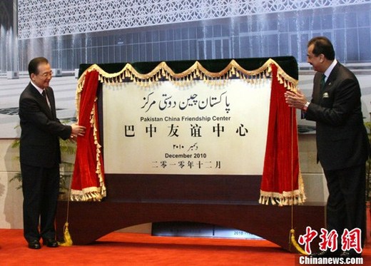 12月18日,中國總理溫家寶與巴基斯坦總理吉拉尼共同為“巴中友誼中心”揭牌。中新社記者 周兆軍 攝