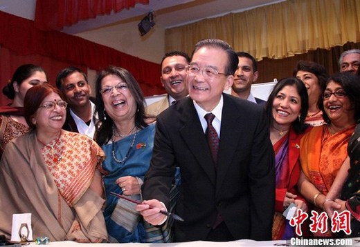 12月15日,正在印度訪問的中國總理溫家寶參觀了泰戈爾國際學校,並現場教印度學生書寫“中印友好”四個字。中新社記者 周兆軍 攝