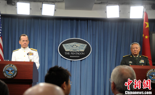 圖為陳炳德當日與美軍參謀長聯席會議主席馬倫在五角大樓舉行聯合記者會。中新社發 吳慶才 攝