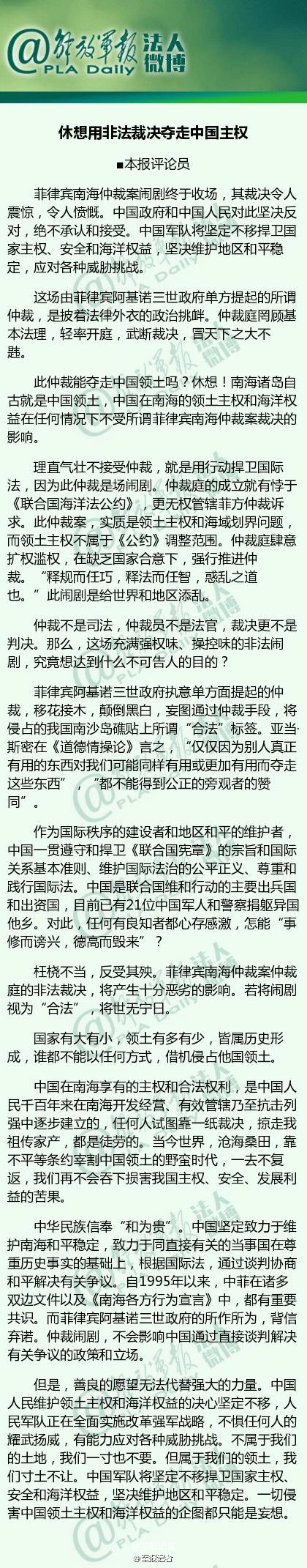 [休想用非法裁決奪走中國主權]菲律賓南海仲裁案鬧劇終于收場,其裁決令人震驚,令人憤慨。中國政府和中國人民對此堅決反對,絕不承認和接受。中國軍隊將 堅定不移捍衛國家主權、安全和海洋權益,不懼任何人的耀武揚威。不屬于我們的土地,我們一寸也不要。但屬于我們的領土,我們寸土不讓!