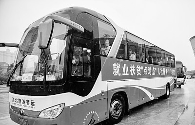 五月十四日,湖北、山東完成《鄂魯支持貧困勞動力外出務工暨勞務協作幫扶協議》簽約。圖為即將赴魯就業的湖北務工人員乘坐大巴車從黃岡出發。新華社記者 程敏攝