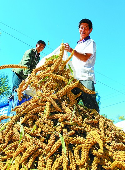 朝陽市朝陽縣勝利鎮吳家杖子村村民收獲金燦燦的谷穗。仇一軍攝