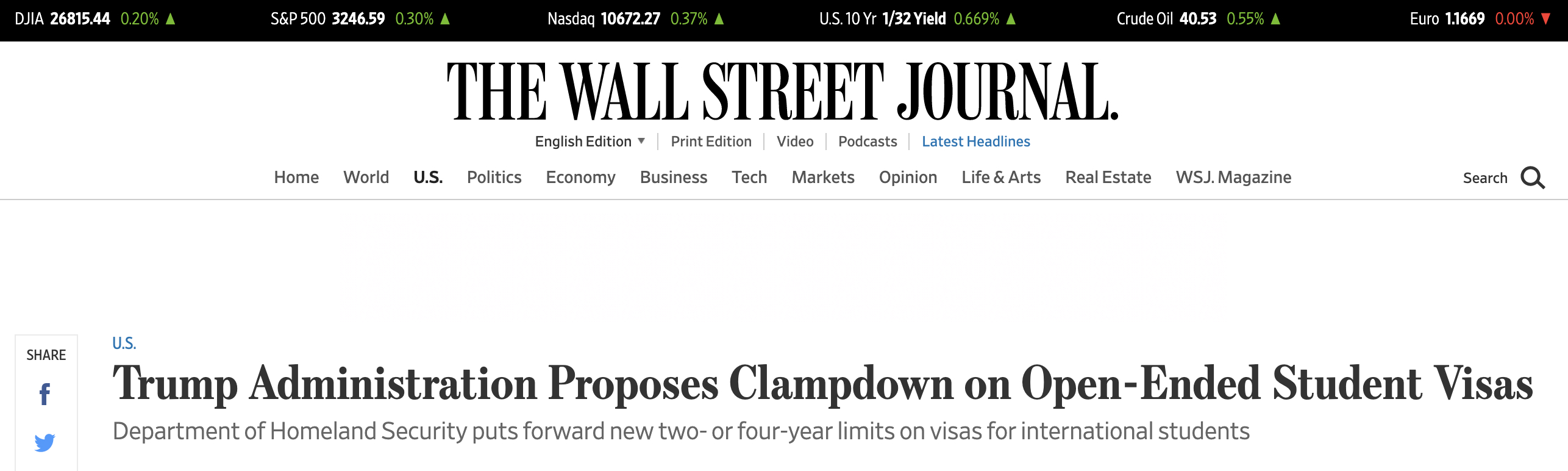 《華爾街日報》報道稱,今年,由于美國政府的移民政策和因新冠疫情而採取的旅行限制,許多學校的留學生入學人數都出現了下降。