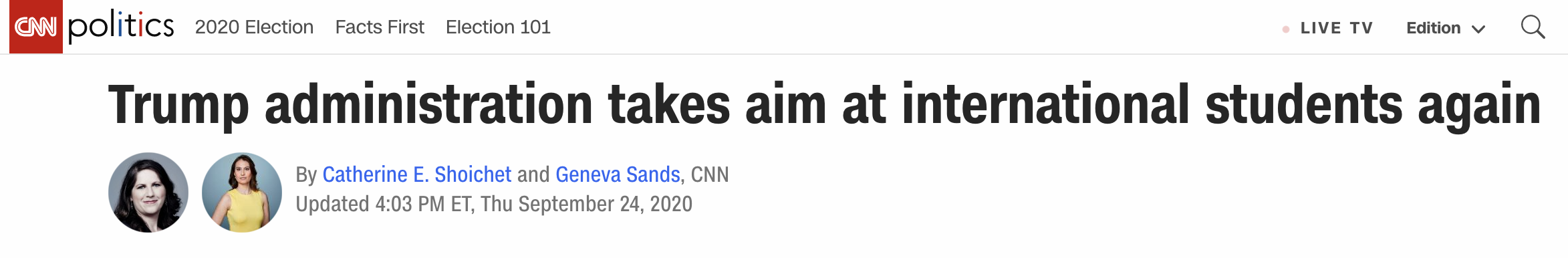 CNN報道稱,這並非特朗普政府首次拿留學生“開刀”。今年7月,美國政府曾出臺一項涉留學生簽證的新規,稱不會給在秋季學期僅上網課的留學生發放簽證,也將不允許這些學生進入美國。