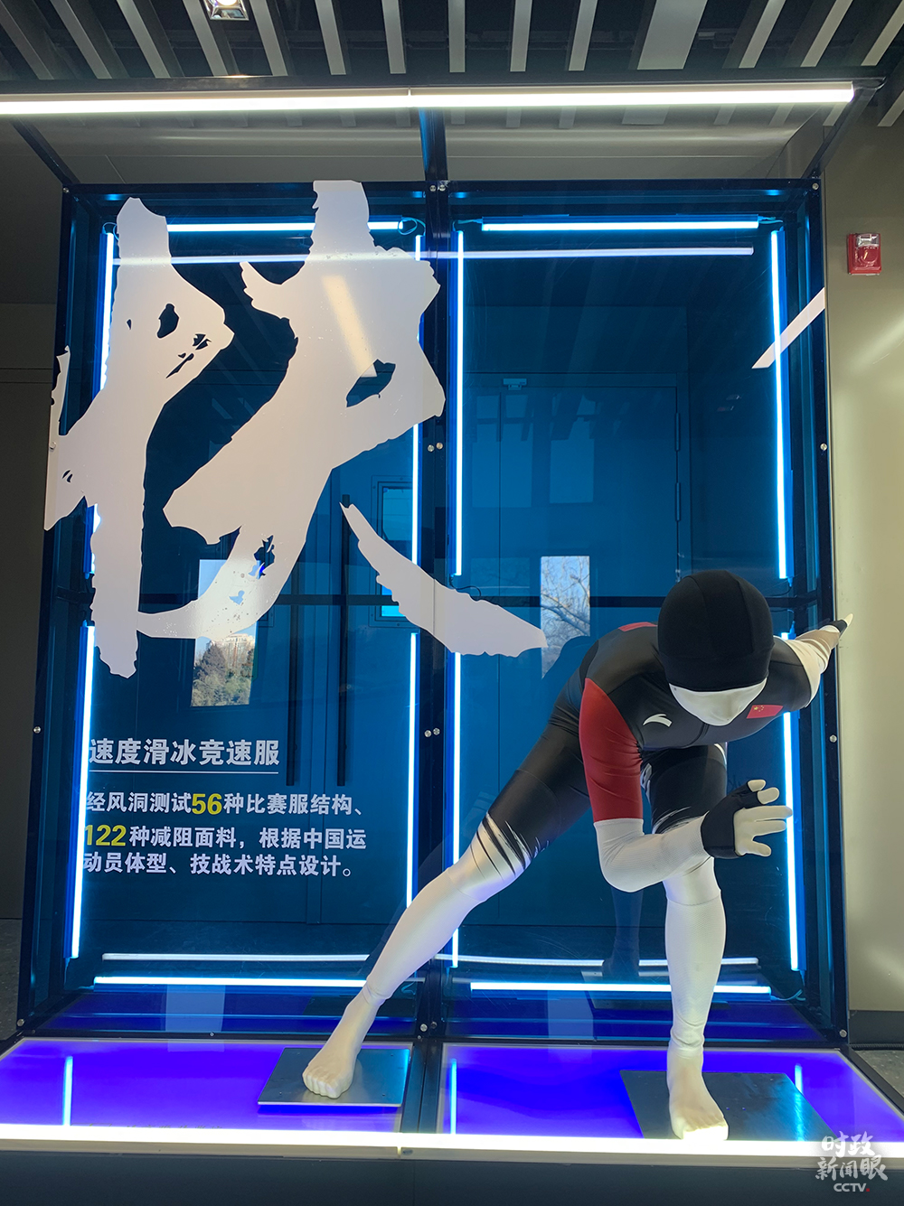 △首都體育館內展示了多款訓練服,體現“快護暖美”的設計理念。這是速度滑冰競速服,經風洞測試56種比賽服結構、122種減阻面料,根據中國運動員體型、技戰術特點設計而成。(總臺央視記者范一鳴拍攝)