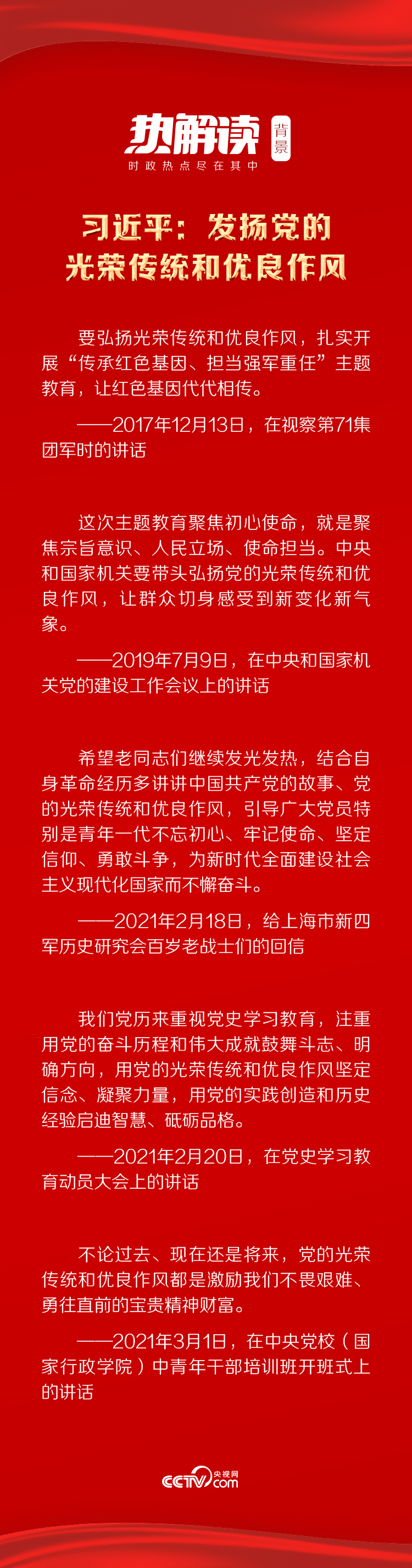 黨的十八大以來,習近平總書記多次強調傳承好黨的光榮傳統和優良作風。前不久,總書記給上海市新四軍歷史研究會百歲老戰士們回信、出席黨史學習教育動員大會,再次提及結合黨史學習教育,講好中國共產黨的故事、發揚黨的光榮傳統和優良作風。