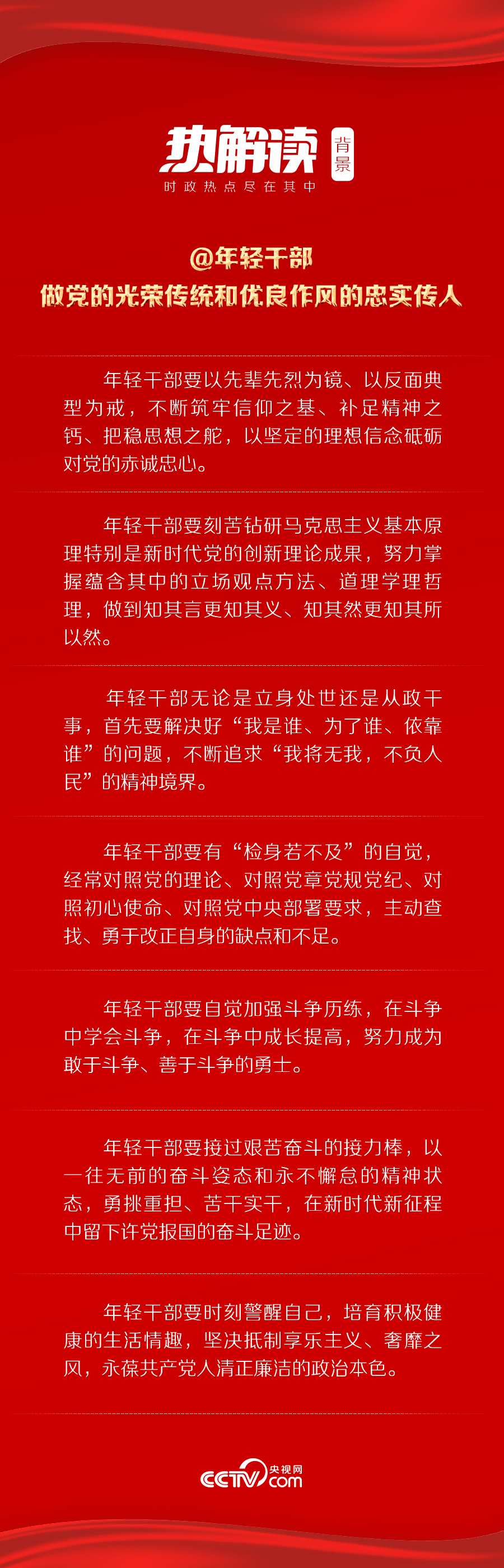 年輕幹部是黨和國家事業接班人,承擔著新時代全面建設社會主義現代化國家的艱巨任務。抗疫一線,有他們以生命赴使命的勇毅;脫貧攻堅主戰場,有他們“不獲全勝,決不收兵”的決心;中華大地上,有他們只爭朝夕的奮鬥身影。