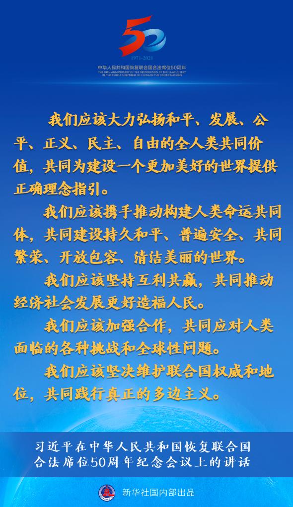10月25日,習近平主席在北京出席中華人民共和國恢復聯合國合法席位50周年紀念會議並發表重要講話。約20分鐘的講話,“共同”一詞出現了24次。