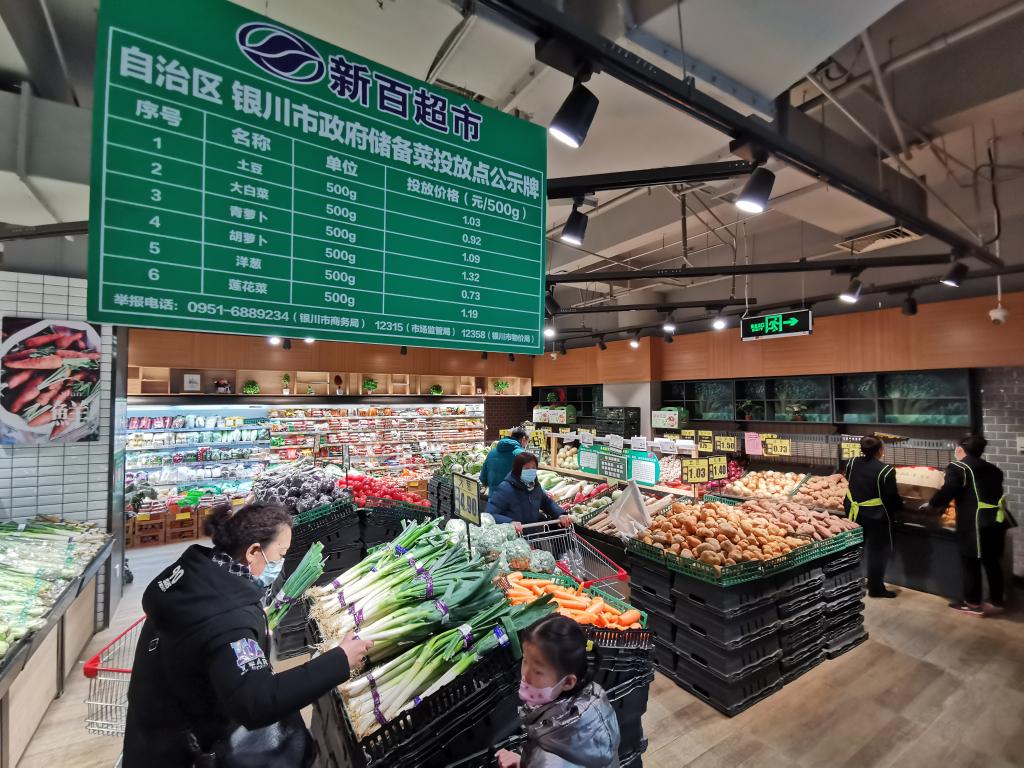 大白菜每斤0.92元、土豆每斤1.03元、鮮羊肉每斤34元……在寧夏回族自治區銀川市新百連超老大樓店,綠色的公示牌上明確標示著政府儲備肉菜價格。顧客們推著購物車穿梭在貨架之間,不時停下來買塊肉,或是挑揀蔬菜。看到哪個貨架上的貨物少了,超市工作人員便會手腳麻利地補貨。