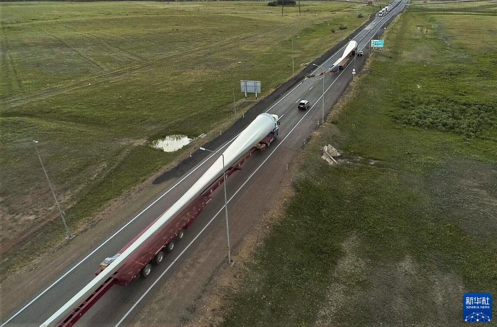 2020年6月23日,在哈薩克斯坦卡拉幹達至努爾蘇丹段公路,卡車車隊運輸70米長的風機葉片(無人機拍攝)。新冠疫情期間,中國和哈薩克斯坦克服困難,繼續推動新能源領域合作。中國生產的風電設備跨越數千公里運輸至哈薩克斯坦,助力哈薩克斯坦可再生能源項目。新華社發(奧斯潘諾夫攝)