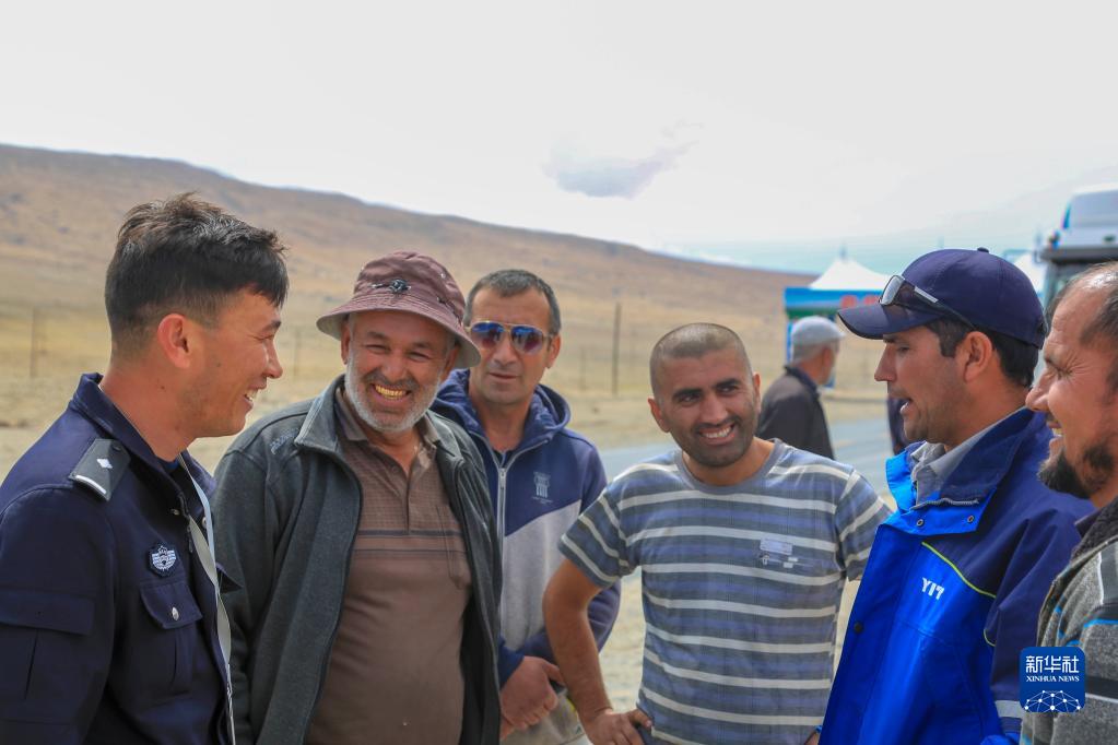 2019年6月11日,位于新疆塔什庫爾幹塔吉克自治縣的卡拉蘇出入境邊防檢查站的民警向塔吉克斯坦司機介紹出入境相關事宜。新華社發(黃歡 攝)
