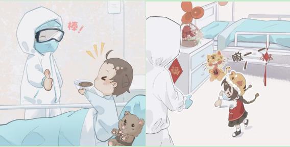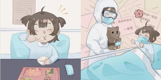 時下,整個社會都在關注著這群孩子們的治療情況,出乎意料的是,疫情面前,孩子們表現得堅強懂事,積極配合。近日,天津市本輪本土疫情中確診兒童患者陸續出院後,被送往市第一中心醫院水西院區,繼續接受康復治療和健康監測。天津理工大學藝術學院2020級視覺傳達設計專業的學生楊佳悅,為了給孩子們打氣加油,創作出一組戰“疫”主題漫畫,描繪其在醫院治療、生活的溫馨場景。