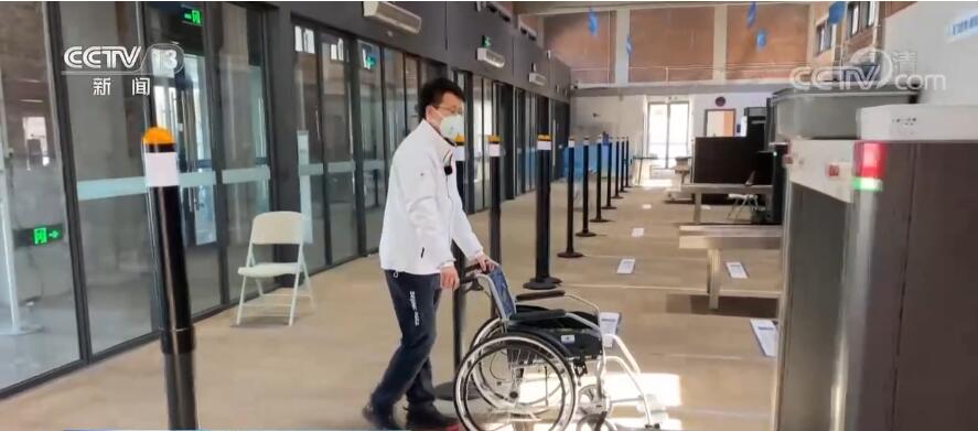 總臺記者 張景:這里是北京冬殘奧村的代表團接待大廳,是各代表團來村的第一站。為了方便坐輪椅人士快速安全通過,在安檢的環節不用過比較窄的安檢門,專門有綠色通道,有安保人員進行手檢。