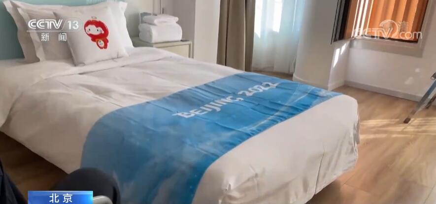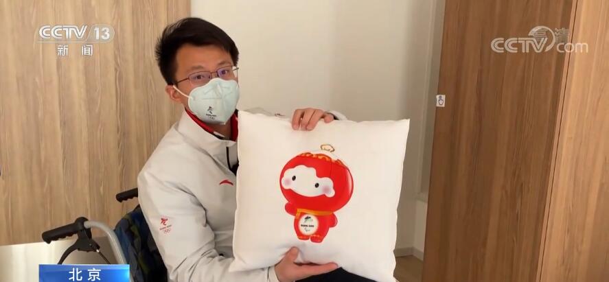 這是冬殘奧運動員公寓的樣板間,有很多無障礙的設施。比如說,所有的門都是單臂可以操作的推拉門,還有扶手、浴凳等等。我們再來臥室里面看看,這是給坐輪椅運動員使用的床,床腳相對于冬奧會的時候降低了10公分,便于上下床。我們看到床頭有一個抱枕。這面是北京冬殘奧會的會徽“飛躍”,這一面是北京冬殘奧會的吉祥物“雪容融”。(抱枕)打開之後就能成為一個毯子,有冬殘奧會各項目的運動圖標,這個抱枕到時候是送給運動員。