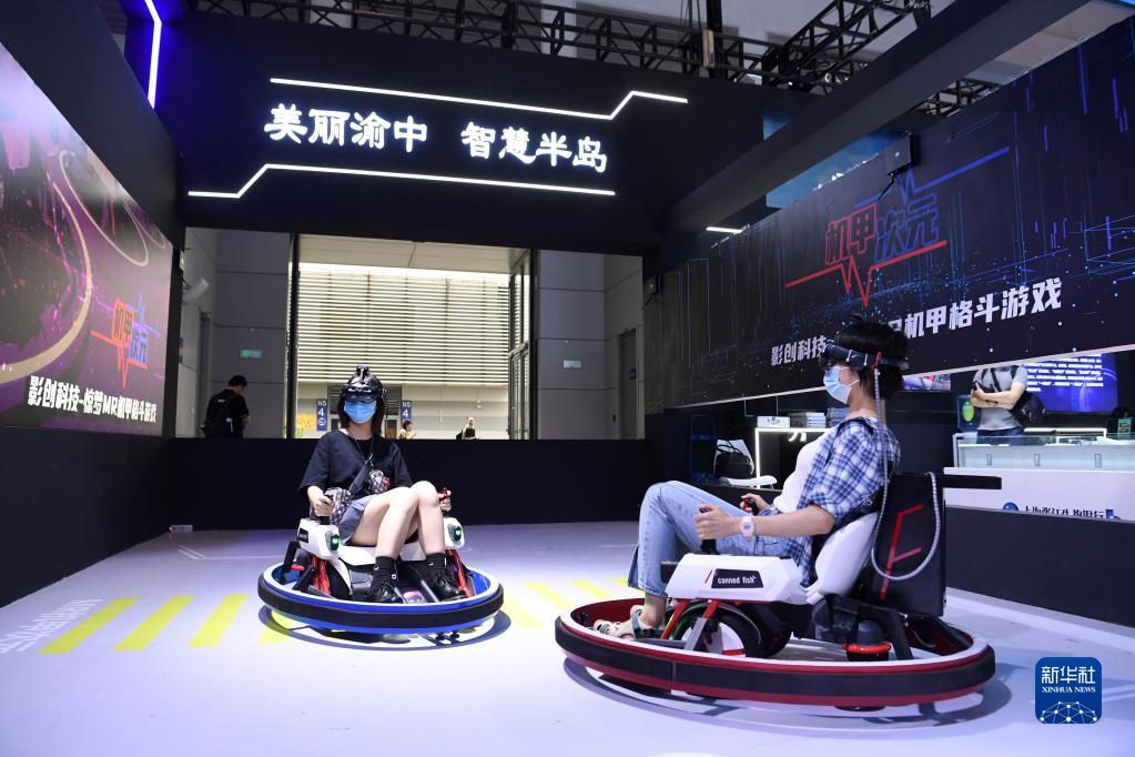 2021年8月23日,觀眾在2021中國國際智能產業博覽會上通過MR技術體驗機甲格鬥遊戲。新華社記者 唐奕 攝