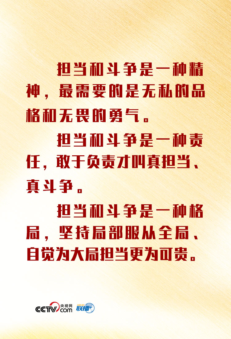總書記在講話中勉勵年輕幹部要發揚擔當和鬥爭精神。這些年,正是因為有了這樣的思想準備,我們才能從容應對一係列風險考驗。無數事實告訴我們,唯有以狹路相逢勇者勝的氣概,敢于鬥爭、善于鬥爭,我們才能贏得尊嚴、贏得主動,切實維護國家主權、安全、發展利益。