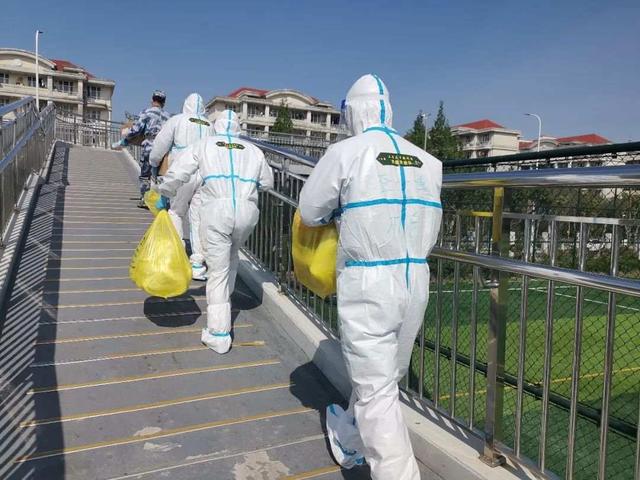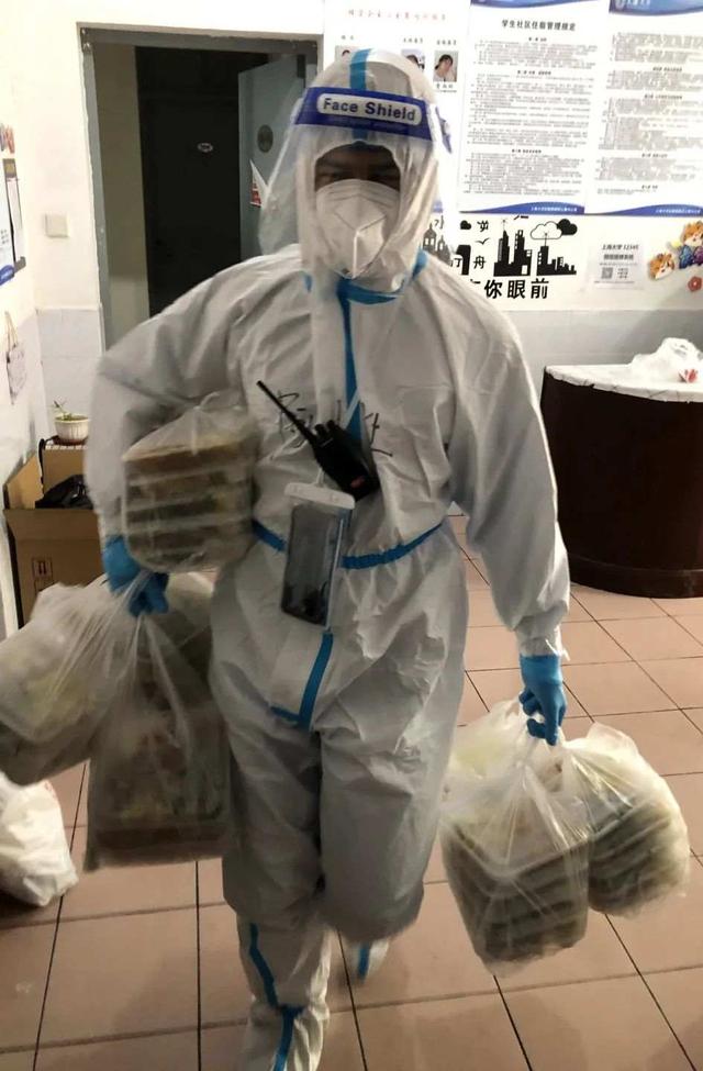 4月中旬,上海氣溫反復,有時大雨傾盆,有幾天最高溫度近30攝氏度。回憶起那次高溫天的任務,趙永吉記憶猶新:“為了及時將餐飯送到學生們手中,隊員們一個臺階接一個臺階、一層又一層,上樓、下樓……循環往復地爬樓梯,終于完成了發放。結束送餐的時候,脫掉防護服的我們就像是洗了一個熱水澡一樣。”
