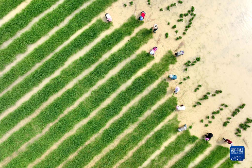 6月7日,村民在貴州省黔東南苗族侗族自治州岑鞏縣大有鎮臘恰畈村整理秧苗(無人機照片)。