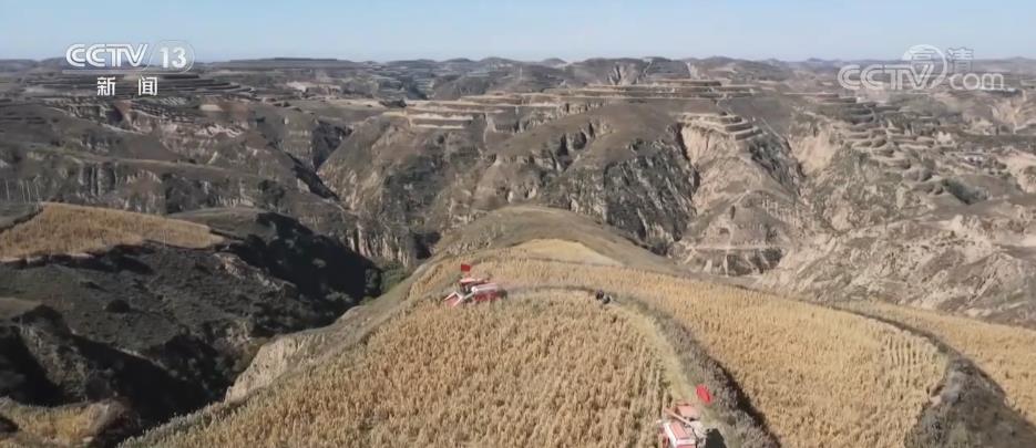 在米脂縣萬畝高標準農田里,收割機在谷田里來回穿梭,保證顆粒歸倉。今年,當地雨水充沛,谷穗籽粒飽滿、長勢喜人,預計今年谷子畝產將達到800斤,每畝較去年增收900到1000元。