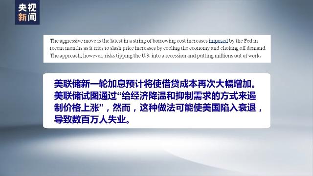 美國廣播公司發表評論稱,美聯儲新一輪加息預計將使借貸成本再次大幅增加。美聯儲試圖通過“給經濟降溫和抑制需求的方式來遏制價格上漲”,然而,這種做法可能使美國陷入衰退,導致數百萬人失業。
