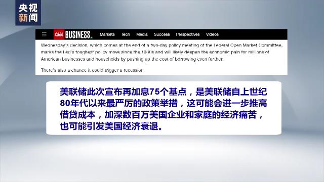 美國有線電視新聞網評論稱,美聯儲此次宣布再加息75個基點,是美聯儲自上世紀80年代以來最嚴厲的政策舉措,這可能會進一步推高借貸成本,加深數百萬美國企業和家庭的經濟痛苦,也可能引發美國經濟衰退。
