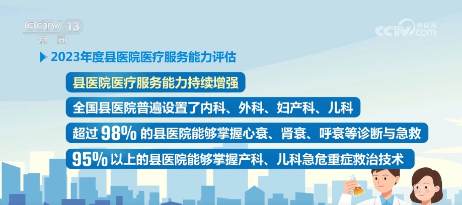 評估顯示,縣醫院醫療服務能力持續增強。全國縣醫院普遍設置了內科、外科、婦產科、兒科。超過98%的縣醫院能夠掌握心衰、腎衰、呼衰等診斷與急救;95%以上的縣醫院能夠掌握產科、兒科急危重症救治技術;超過88%的縣醫院能夠進行多發性創傷的診斷與處理。平均每家縣醫院診療人次為37.01萬,與2022年度基本持平。床位使用率達到87.66%,較2022年度提高了7.07個百分點;平均住院日7.59天。