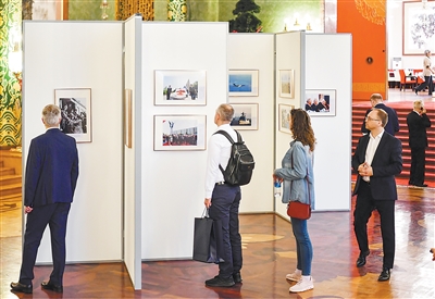 2025年4月18日,在俄羅斯首都莫斯科,嘉賓參觀紀念中國人民抗日戰爭暨世界反法西斯戰爭勝利80周年圖片展。