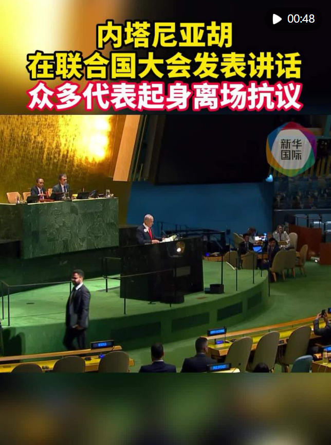 最戲劇性的一幕,出現在26日以色列總理內塔尼亞胡在一般性辯論發言時。他剛上臺,許多會員國代表就紛紛起身退場,以示對以色列在加沙地帶戰爭暴行的憤怒。不少人徑直從內塔尼亞胡面前走開,代表席頓時空空蕩蕩。