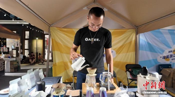 國慶假期,臺灣咖啡師李毅在浙江杭州的咖啡文化嘉年華上手衝咖啡。錢晨菲 攝