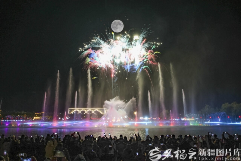 10月6日晚,新源縣天鵝湖景區、大型激光水舞煙花秀與圓月同框。張文庭 攝