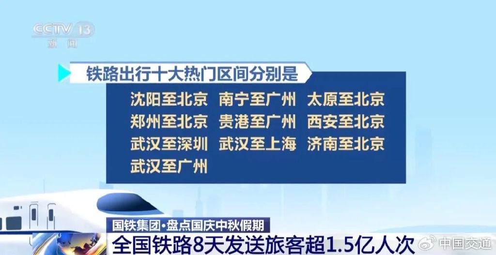 分線路看,這個國慶中秋假期鐵路出行十大熱門區間分別是:沈陽至北京、南寧至廣州、太原至北京、鄭州至北京、貴港至廣州、西安至北京、武漢至深圳、武漢至上海、濟南至北京、武漢至廣州。