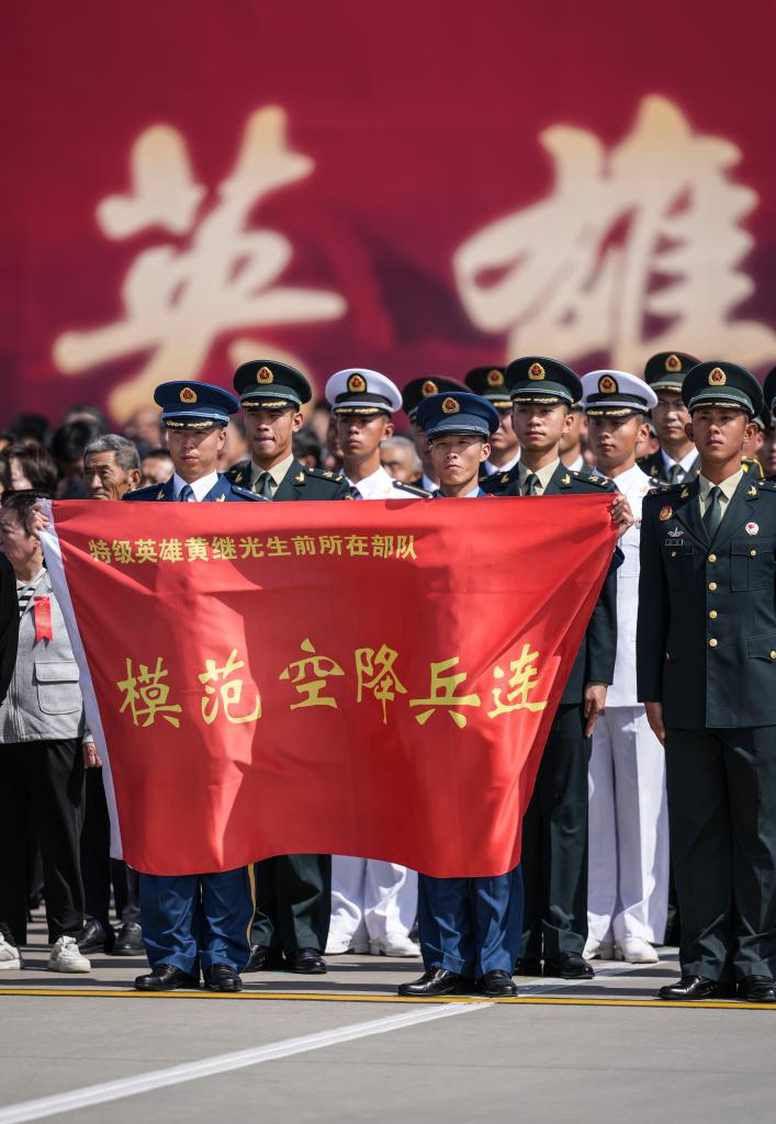9月12日,第十二批在韓中國人民志願軍烈士遺骸回國。這是空軍空降兵某部“黃繼光英雄連”官兵在沈陽桃仙國際機場舉行的迎回儀式上。新華社記者潘昱龍攝