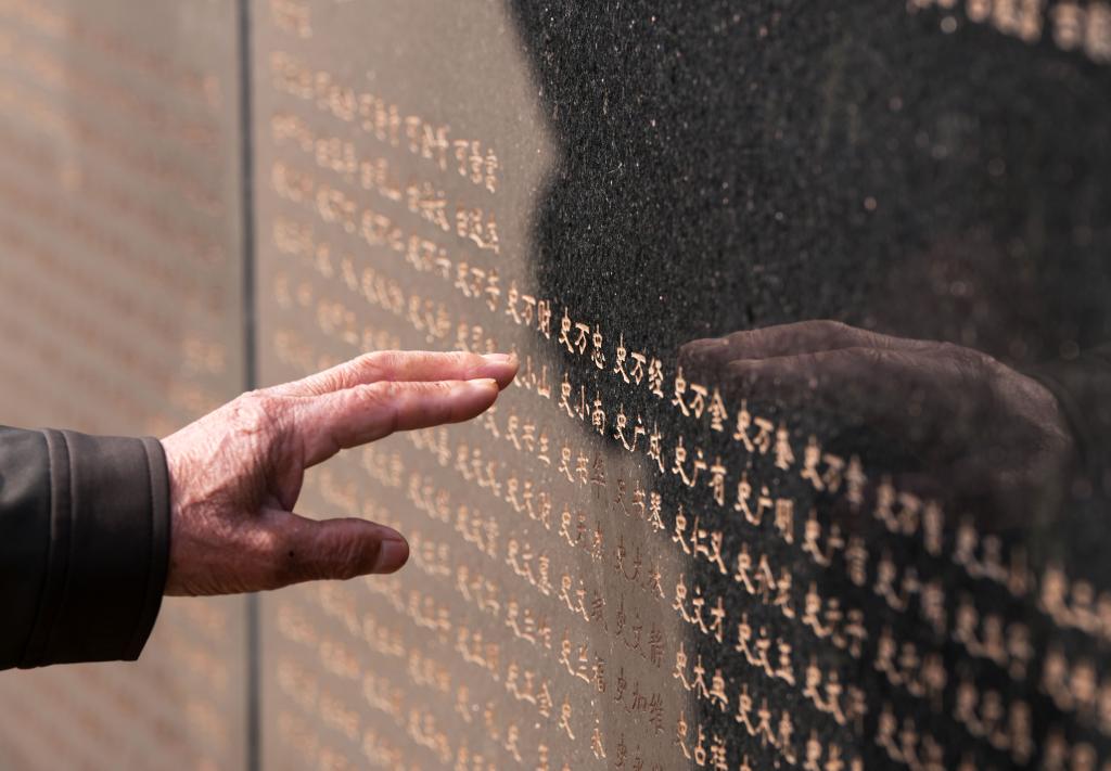 2024年4月3日,在沈陽抗美援朝烈士陵園,史榮升老人手指輕觸刻有父親名字的烈士英名牆。新華社記者李鋼攝