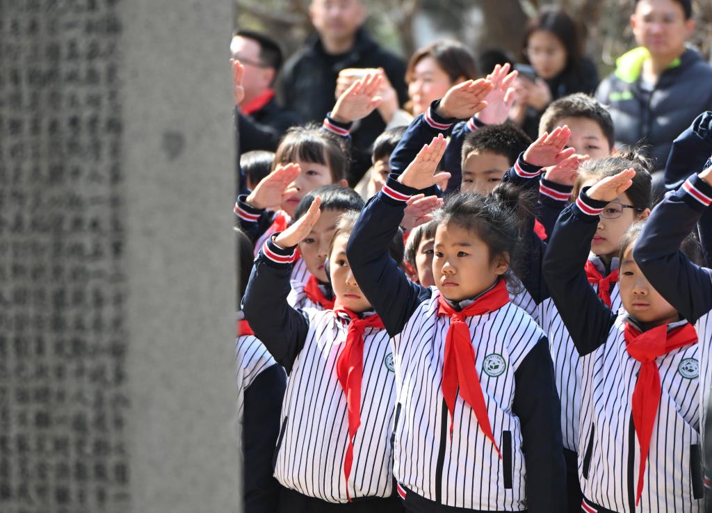 2024年4月2日,在沈陽抗美援朝烈士陵園,少先隊員在沈陽市團市委主辦的清明祭英烈主題隊日活動上,向烈士墓敬禮。新華社記者楊青攝