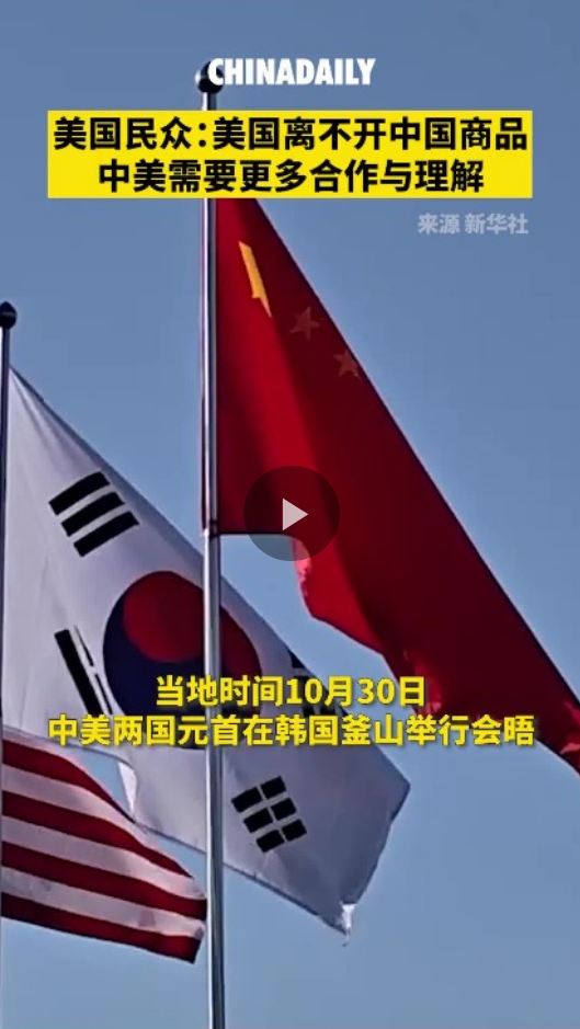 當地時間10月30日,中美兩國元首在韓國釜山舉行會晤。中國日報記者走訪美國街頭,了解美國民眾對此次會晤及中美關係的看法。民眾表示,美國和中國的貿易互依關係不容忽視,兩國需要更多溝通與合作。
