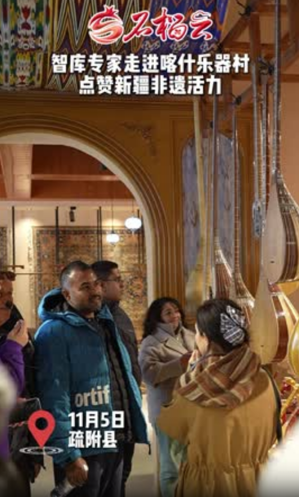 11月5日,“海外智庫看新疆”的學者專家走進喀什地區疏附縣吾庫薩克鎮托萬克吾庫薩克村參觀民族樂器展陳館,深入了解中國新疆在非物質文化遺產保護方面的成果。學者專家們一走進制作工坊,就被冬不拉、艾捷克、熱瓦普等民族樂器吸引,觀看工匠制作樂器,與樂器制作藝人深入交流。