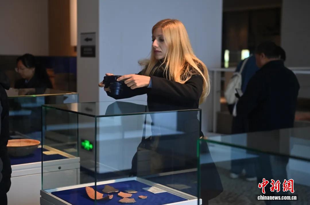 2024年10月22日,2024青年漢學家研修計劃甘肅班團隊22個國家的青年漢學家,走進甘肅省天水市秦安縣大地灣遺址參觀並進行專題研修。圖為漢學家在拍攝大地灣博物館藏品。 中新社記者 李亞龍 攝