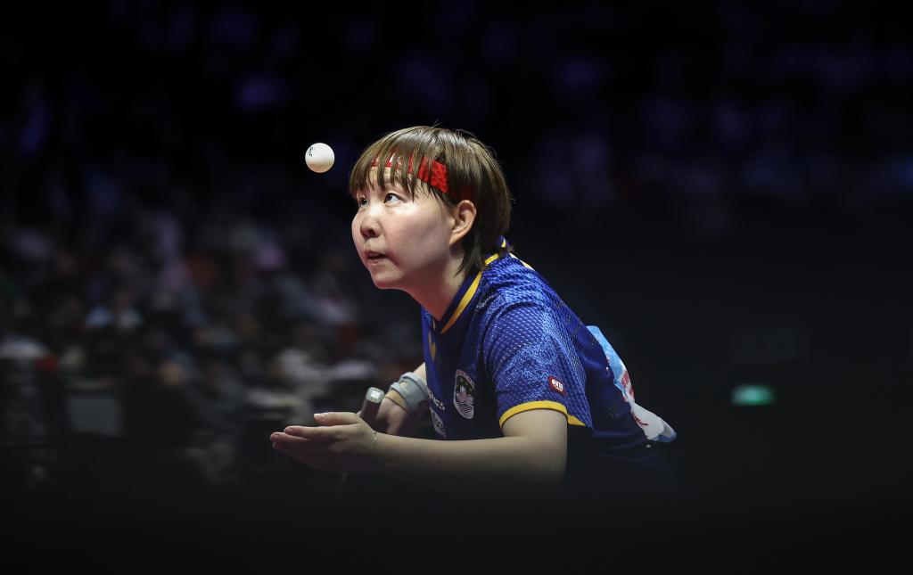 11月16日,澳門隊選手朱雨玲在比賽中發球。新華社記者 陳斌 攝