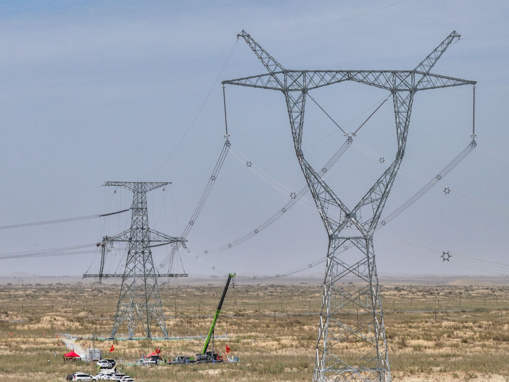 2025年7月13日,在塔里木盆地南緣的新疆和田地區民豐縣,隨著牽引機將最後一段電線成功從183號鐵塔拽至188號鐵塔,歷時15年建設的環塔里木盆地750千伏輸變電工程全線貫通(無人機照片)。新華社記者 丁磊 攝