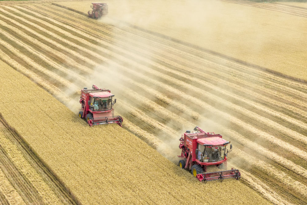 2025年6月9日,河南省三門峽靈寶市西閻鄉東古驛村村民在搶收小麥(無人機照片)。新華社發(杜傑 攝)