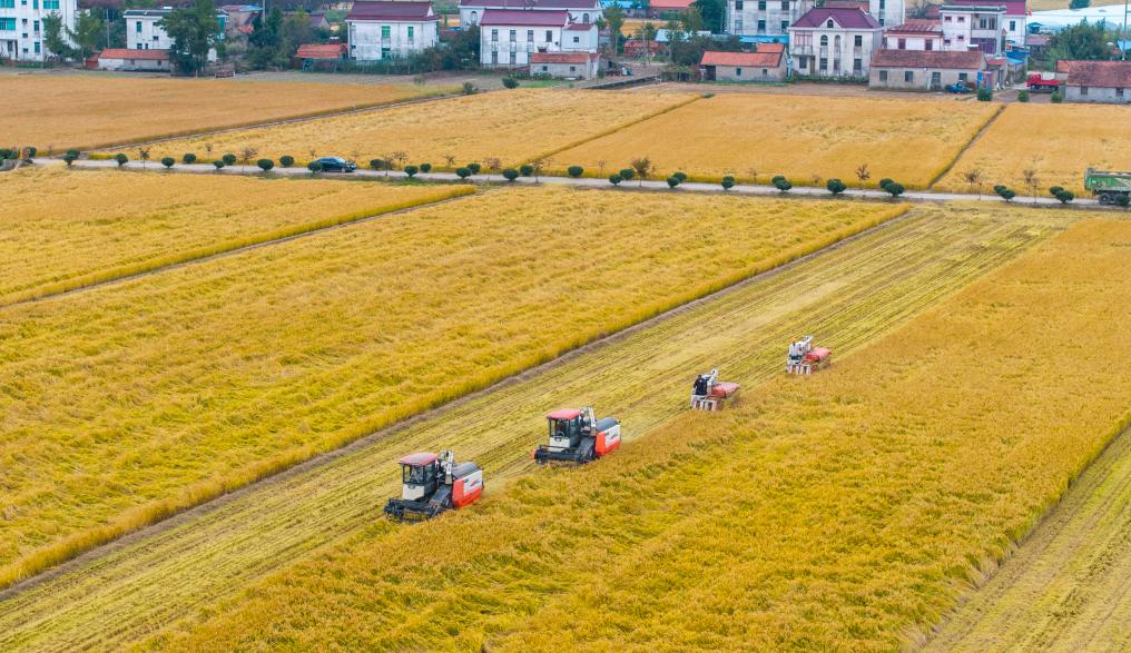 10月30日,在江蘇省南通市通州區十總鎮育民村高標準農田里,村民駕駛農機收割水稻(無人機照片)。 新華社發(翟慧勇攝)